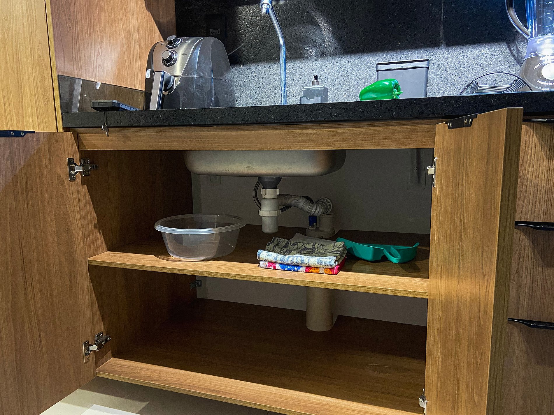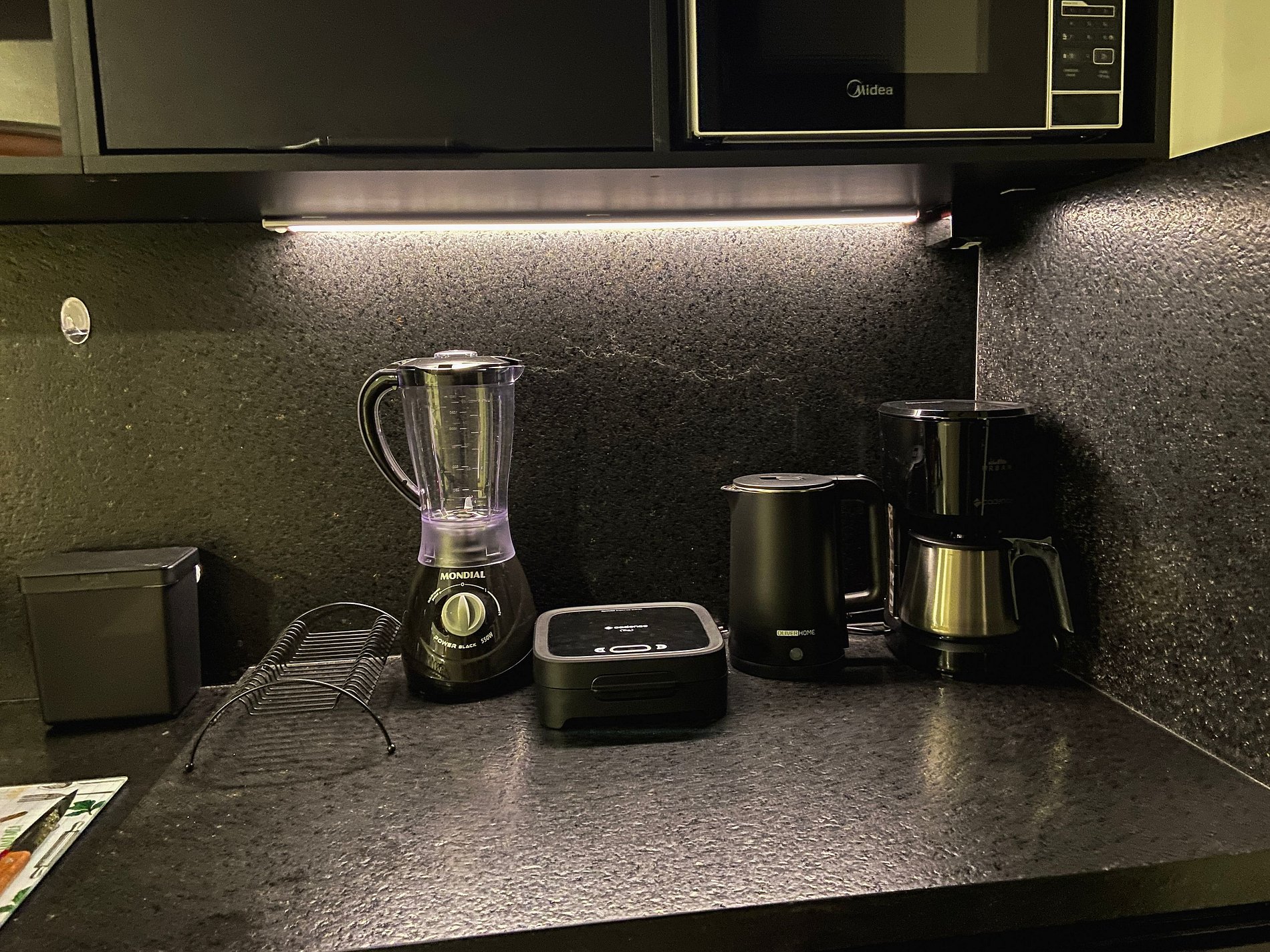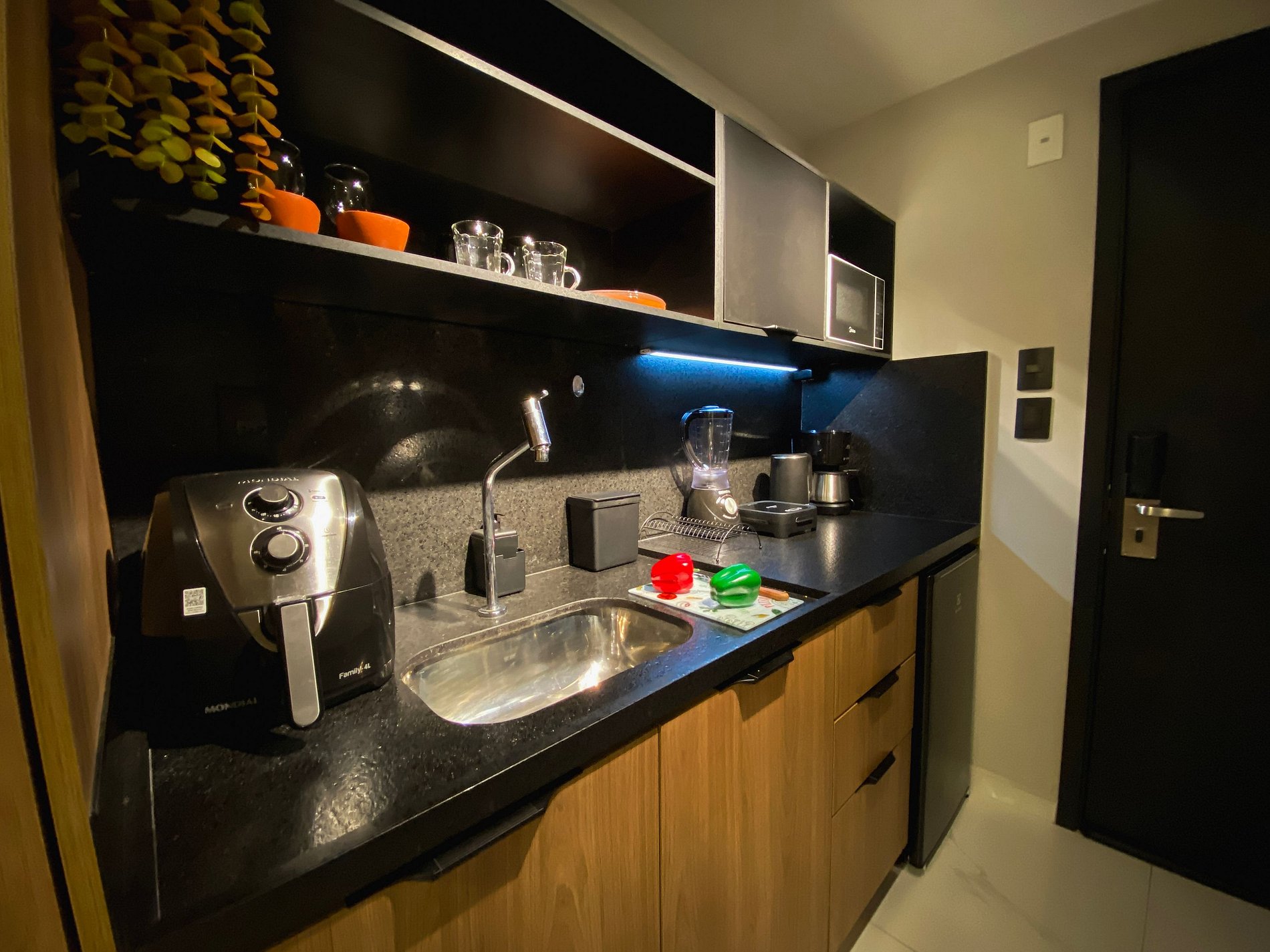 Cozinha equipada – Air Fryer, Micro-ondas, Freezer, sanduicheira e utensílios completo para refeições rápidas.
