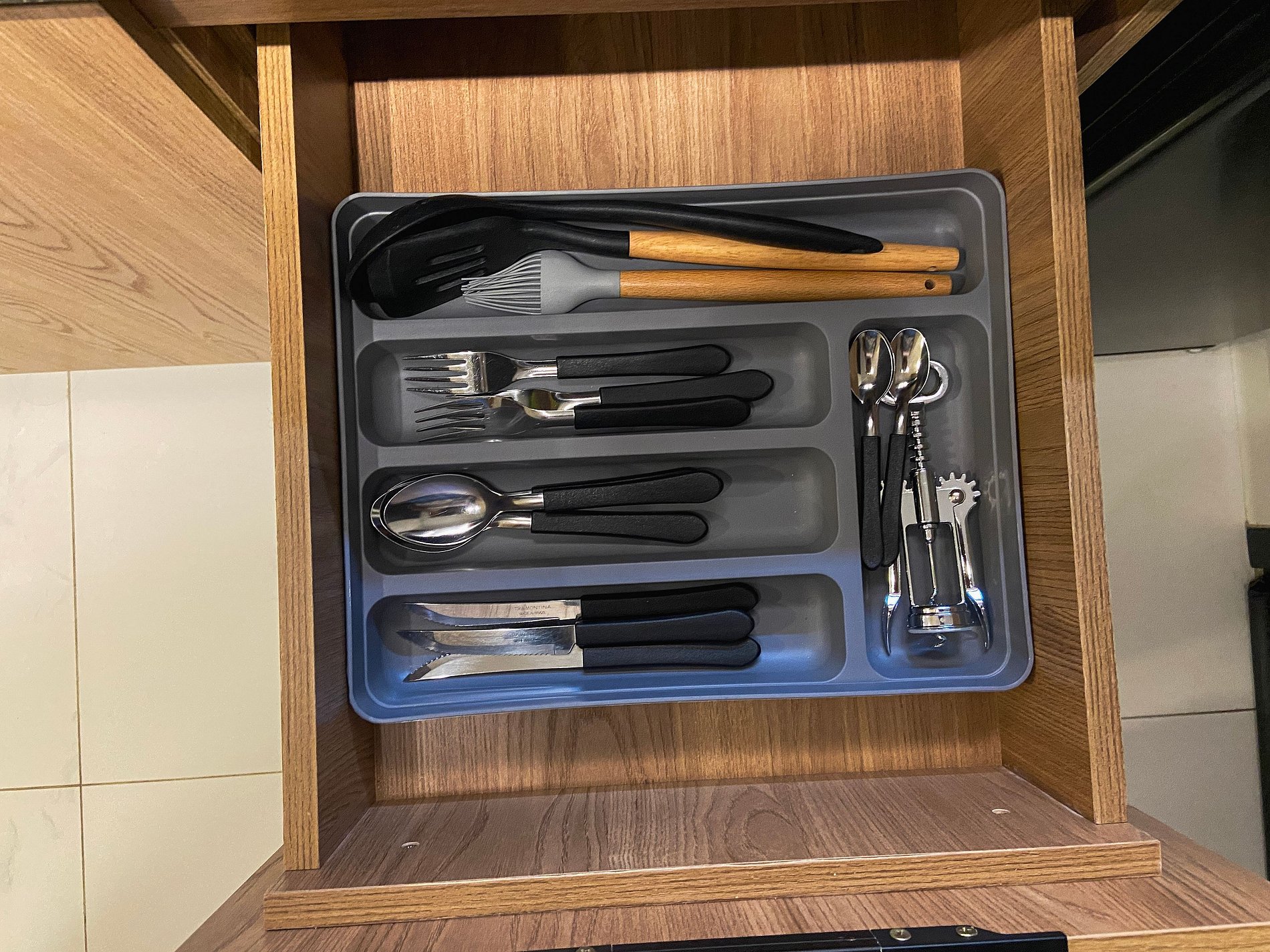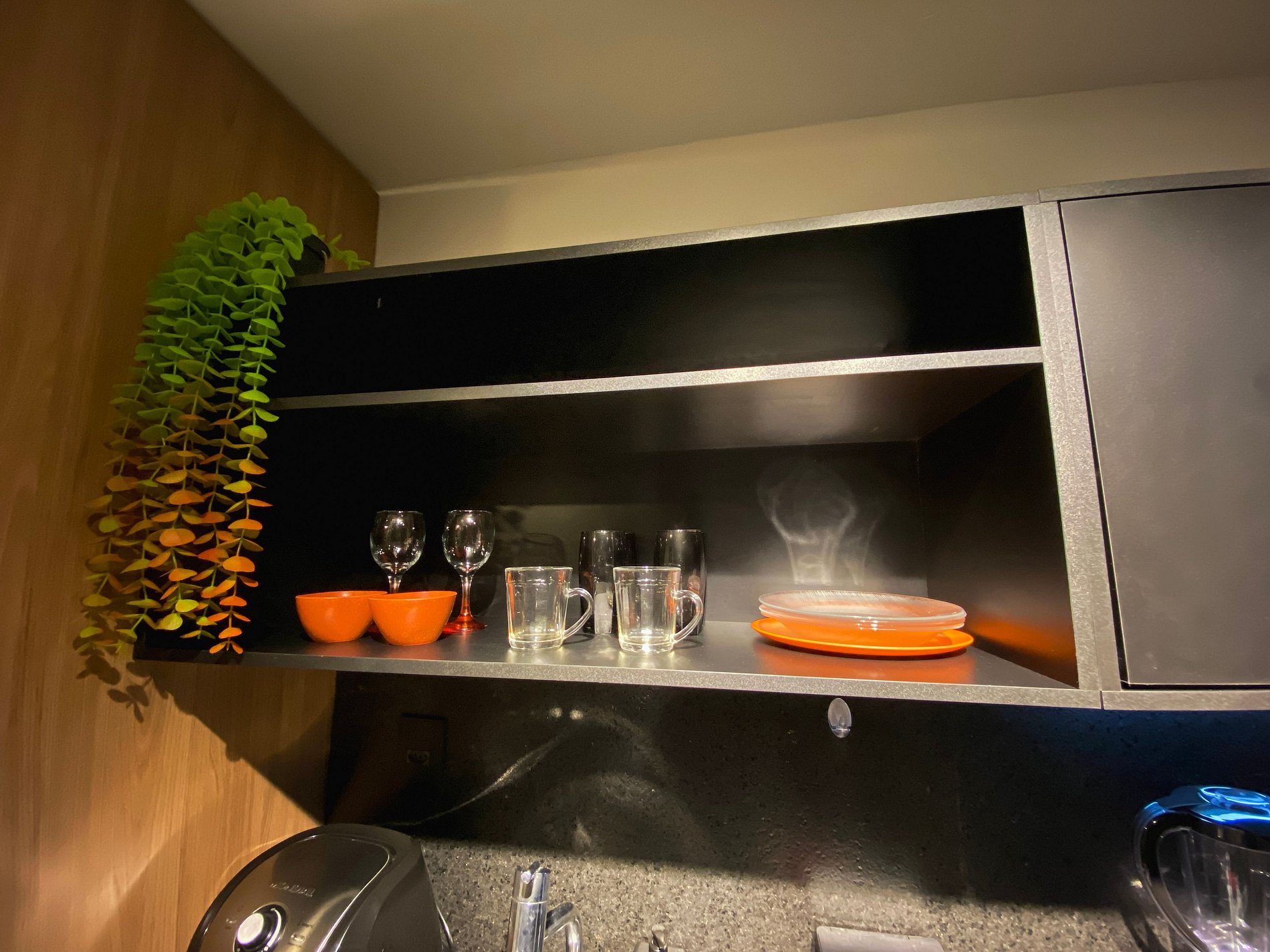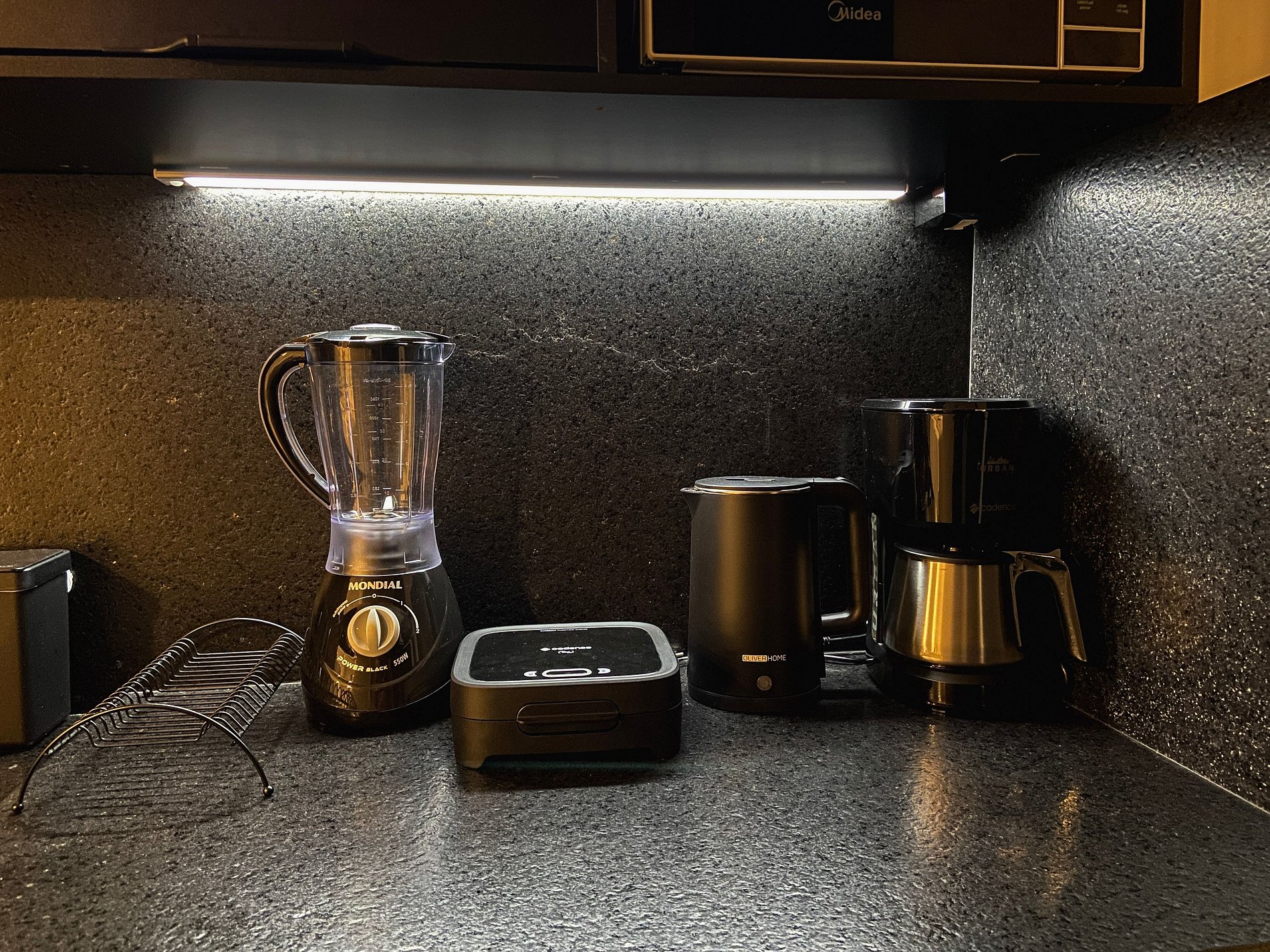 Cozinha equipada – Air Fryer, Micro-ondas, Freezer, sanduicheira e utensílios completo para refeições rápidas.