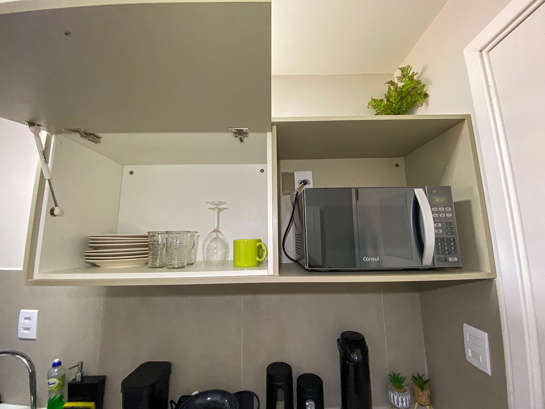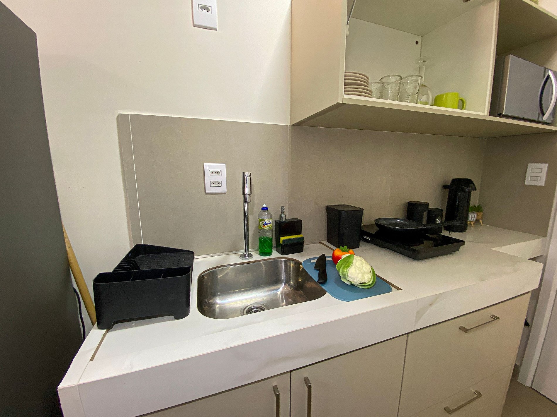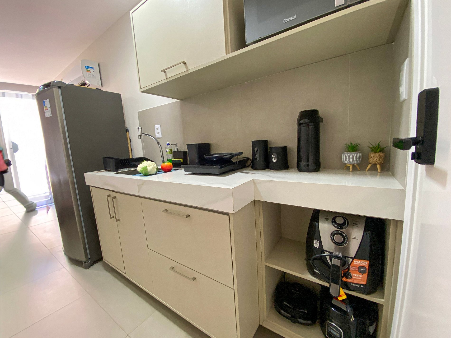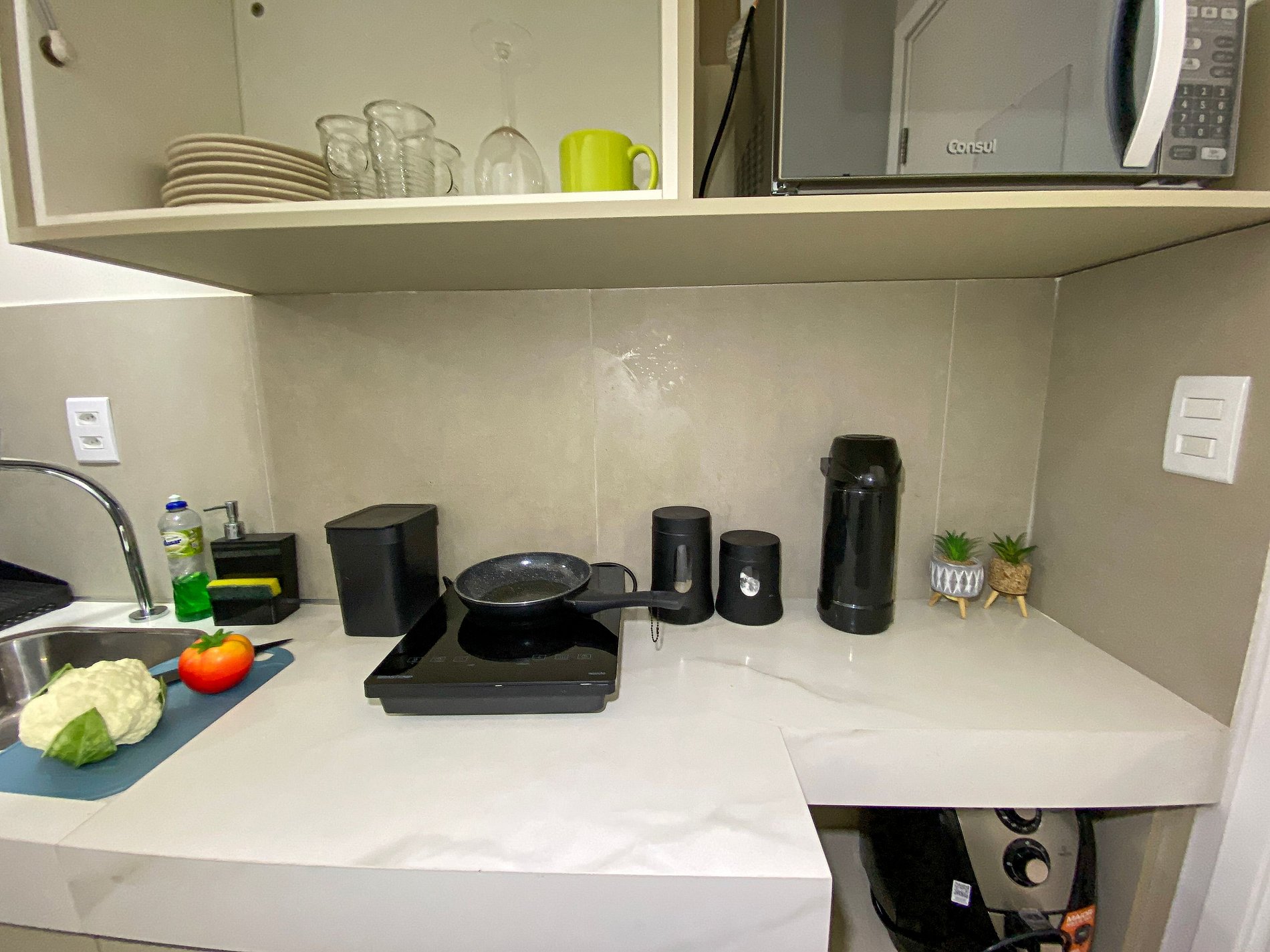 Cozinha equipada – Micro-ondas, Geladeira, Air-Fryer, Cooktop e utensílios básicos para refeições rápidas.