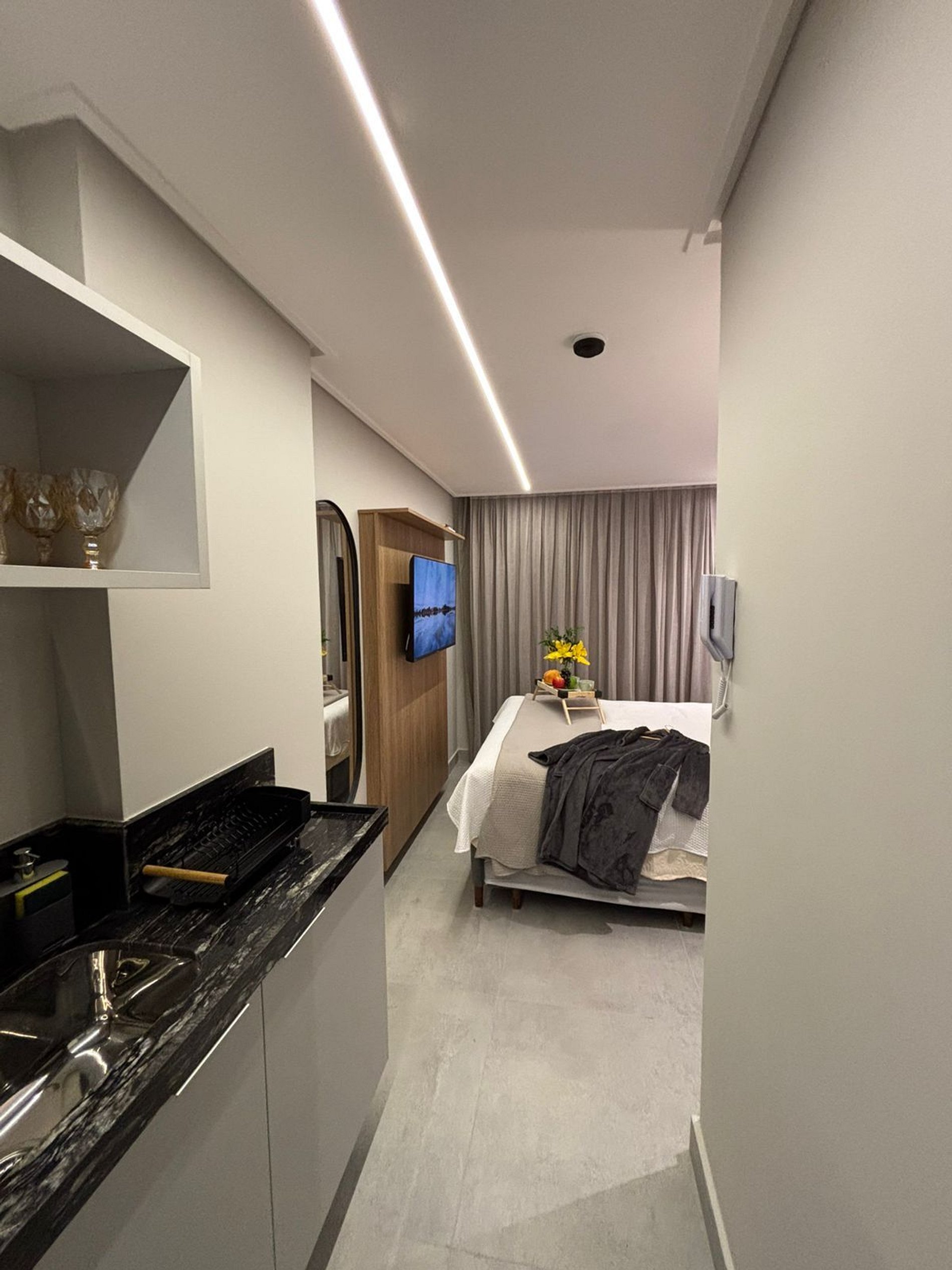 O Flat foi cuidadosamente projetado para oferecer uma experiência única, com todo o conforto e sofisticação que você merece. A unidade conta com uma cama queen, uma cama auxiliar de solteiro e um sofá cama acomodando até 5 hóspedes com praticidade e conforto.