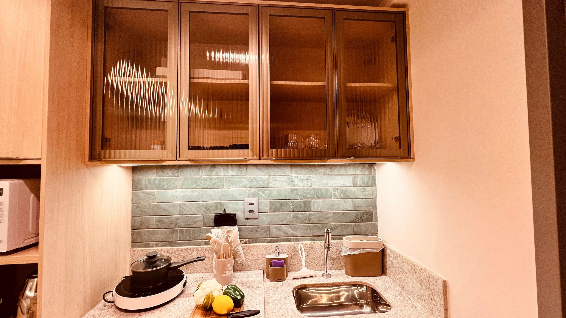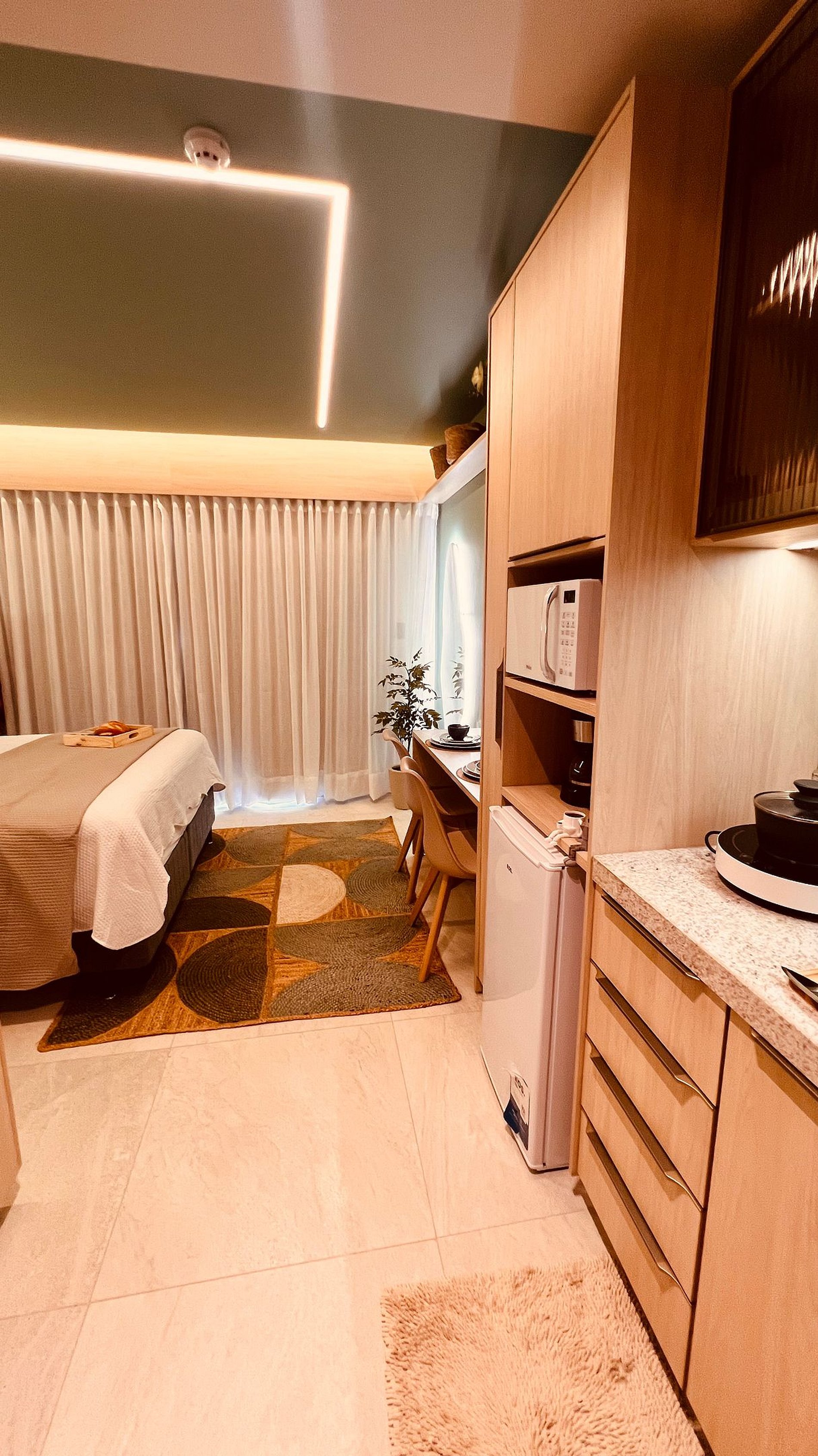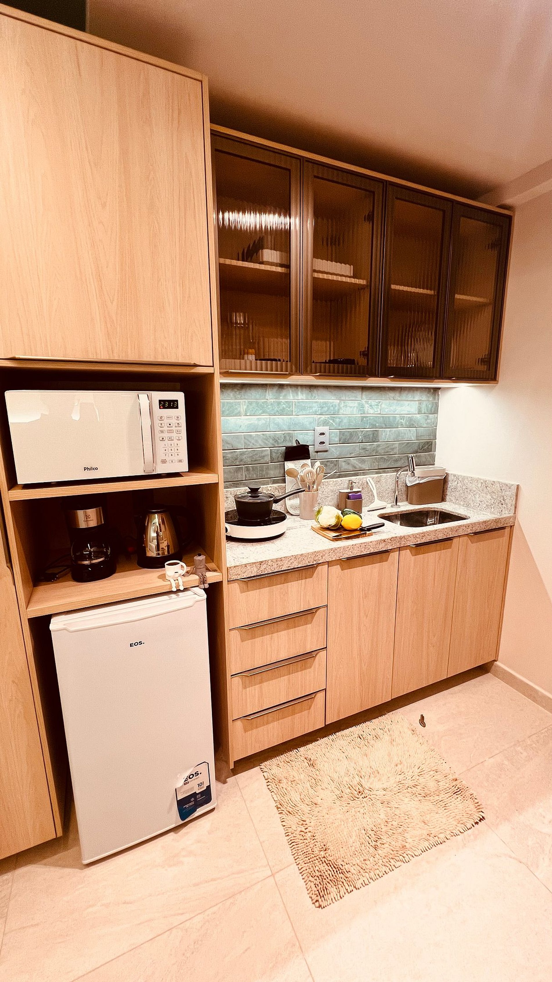 -Cozinha: Geladeira, armário, cooktop de uma boca, micro-ondas, liquidificador, cafeteira, sanduicheira.