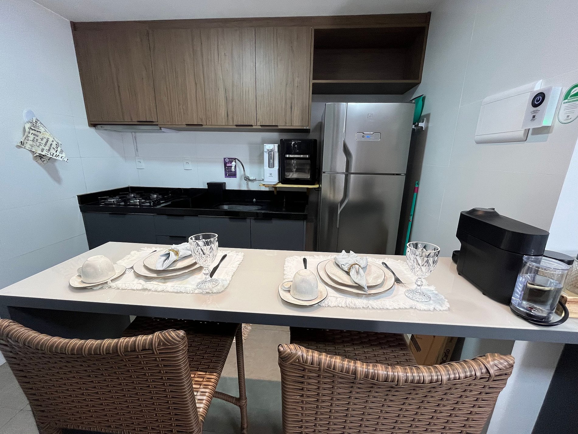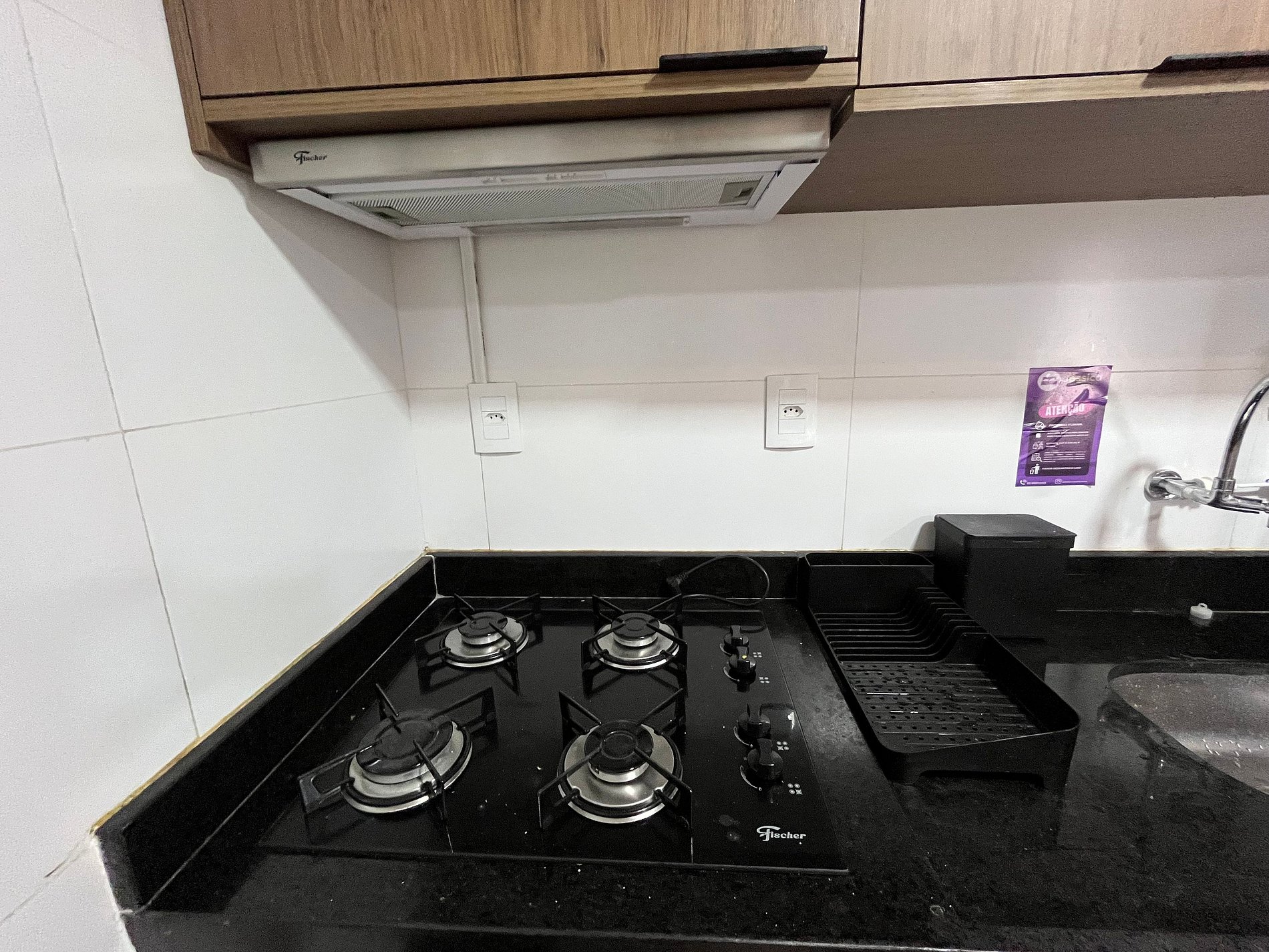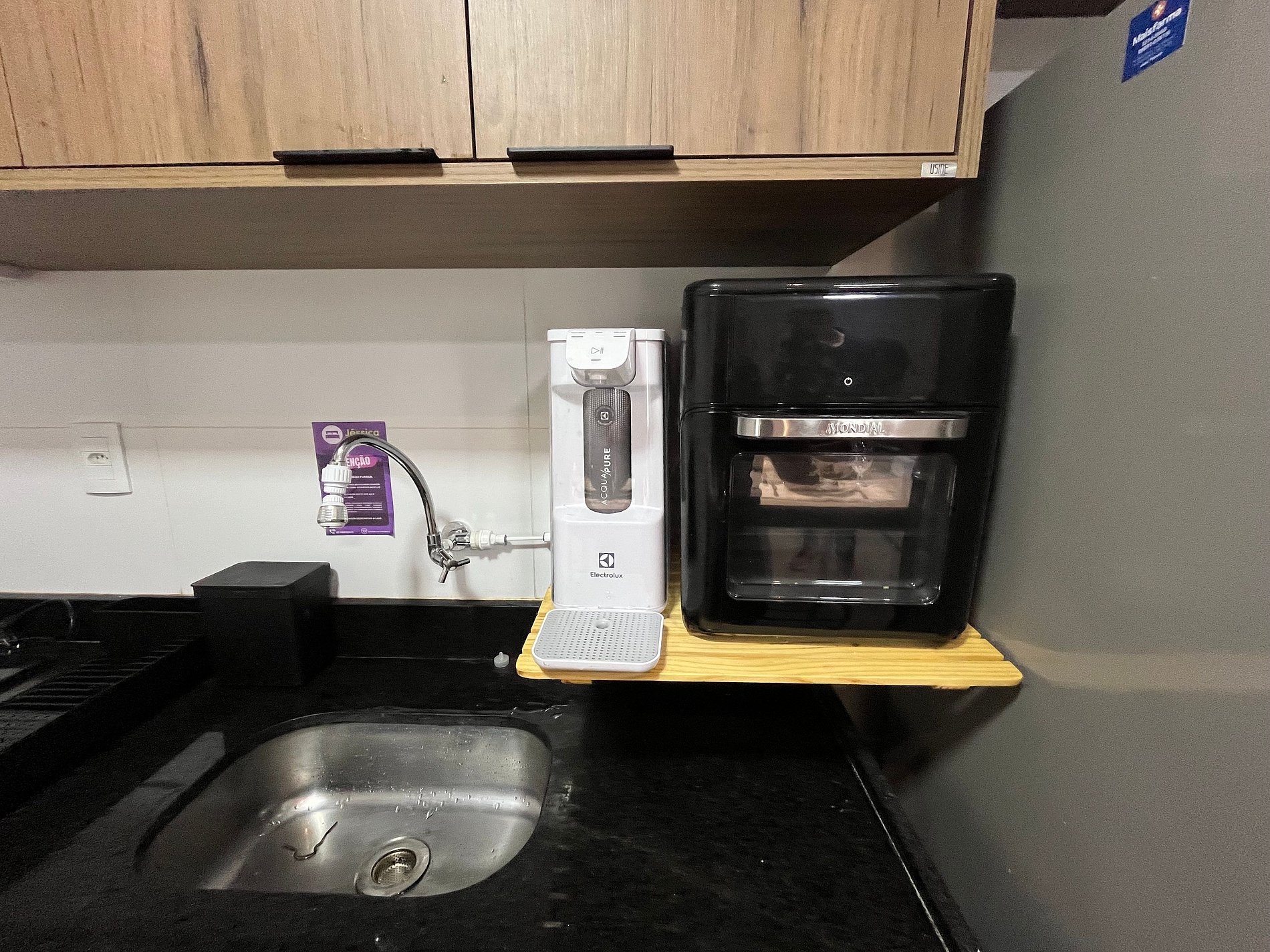 Utensílios de cozinha (panelas, pratos, copos, talheres, etc.)O flat conta com uma cozinha completa, equipada com geladeira, fogão, air fryer, cafeteira, filtro de água e todos os utensílios necessários para você se sentir em casa.