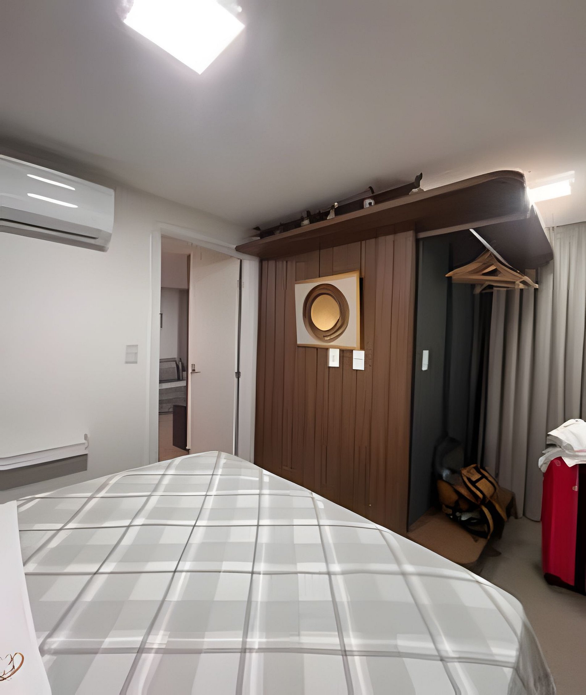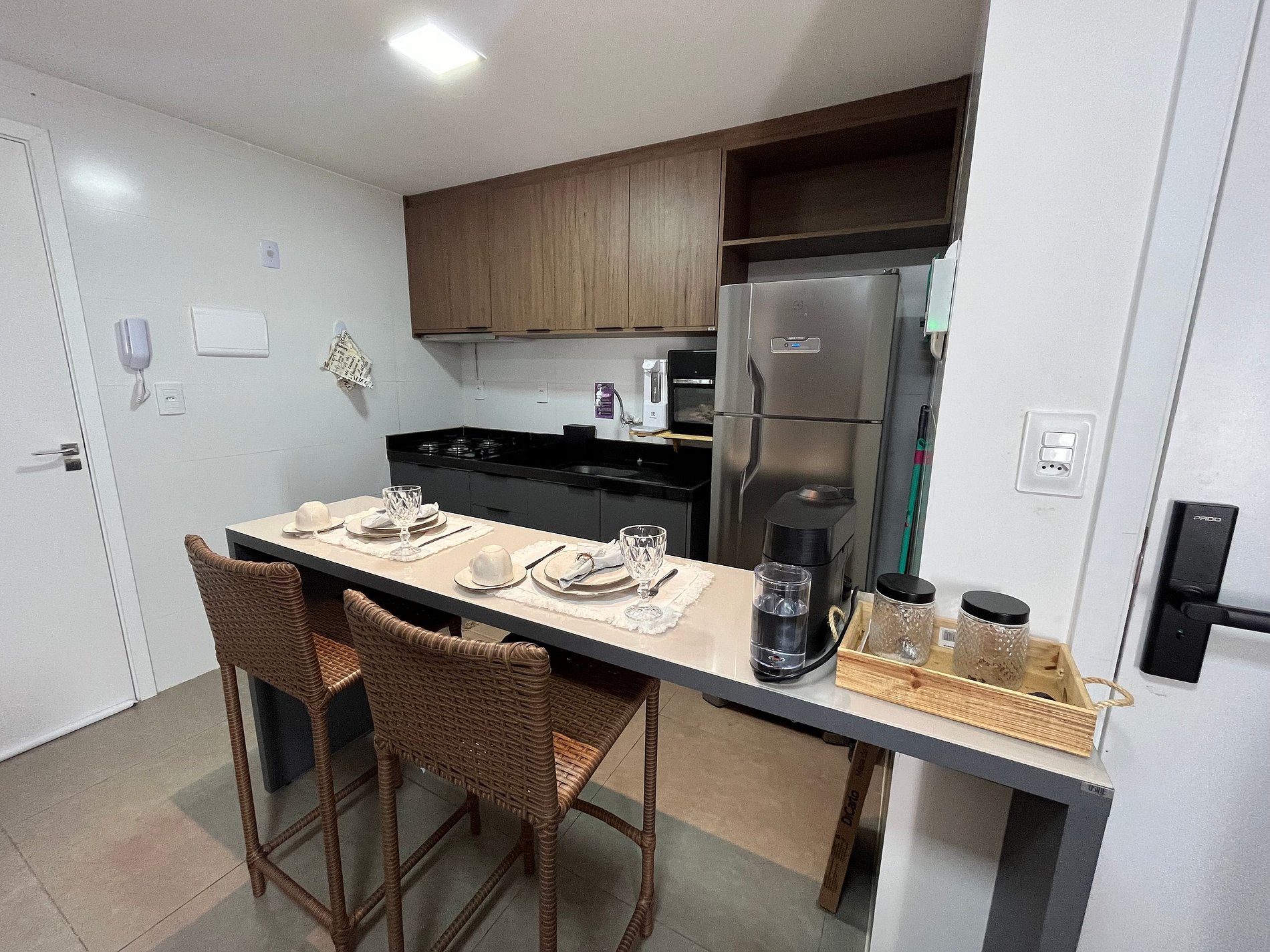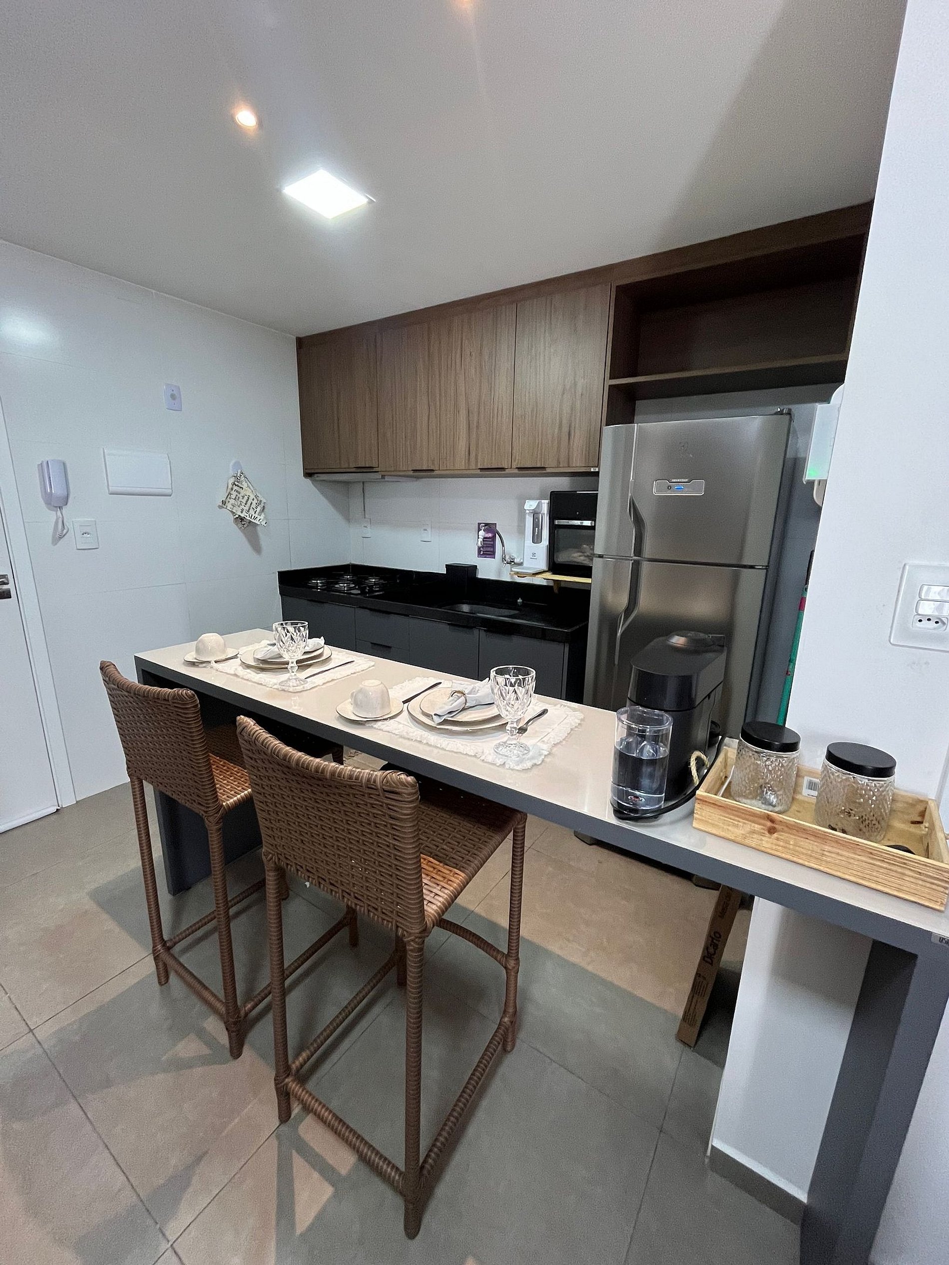 Utensílios de cozinha (panelas, pratos, copos, talheres, etc.)O flat conta com uma cozinha completa, equipada com geladeira, fogão, air fryer, cafeteira, filtro de água e todos os utensílios necessários para você se sentir em casa.