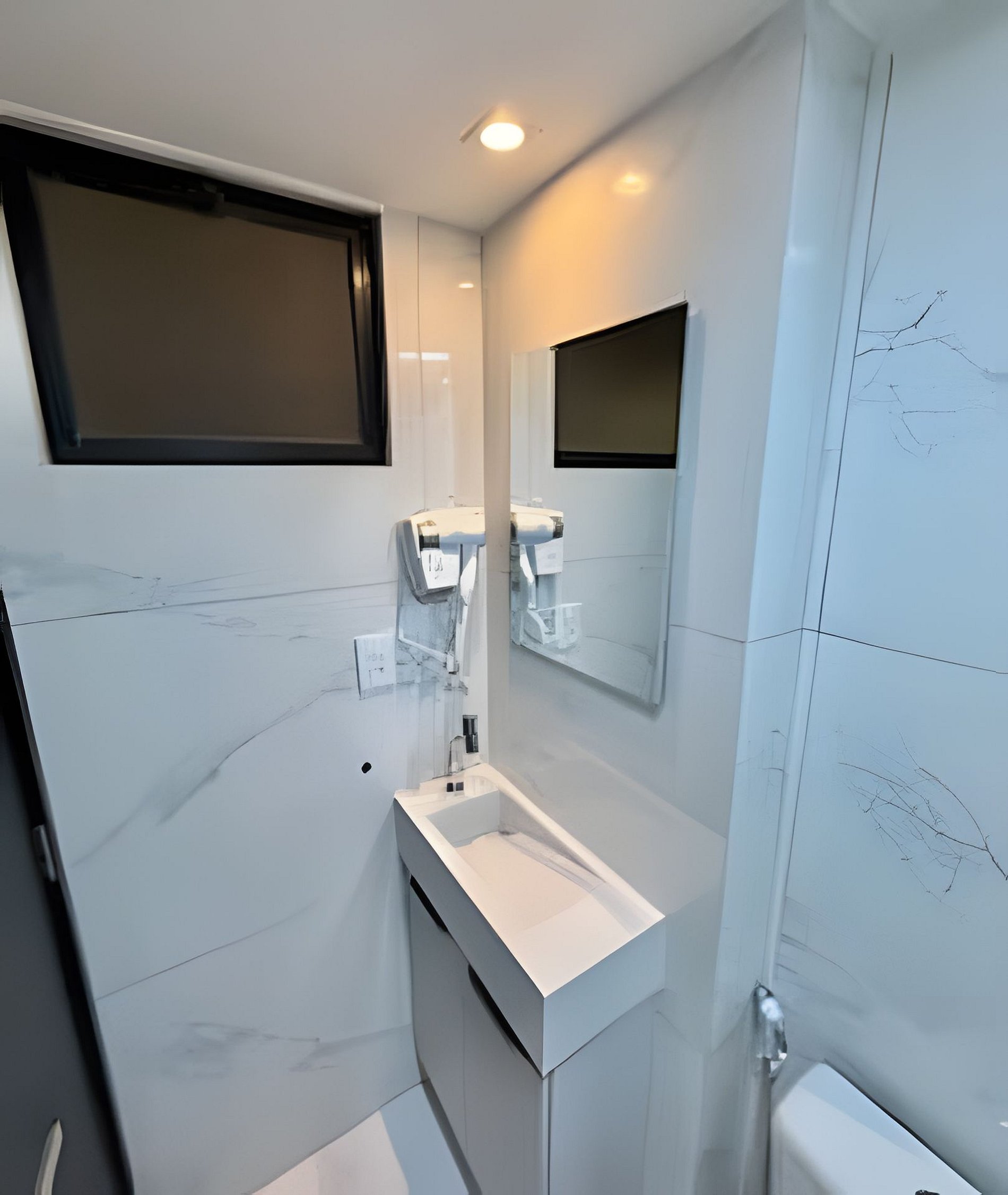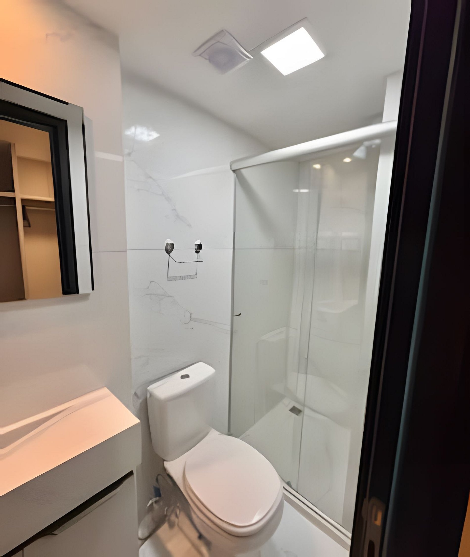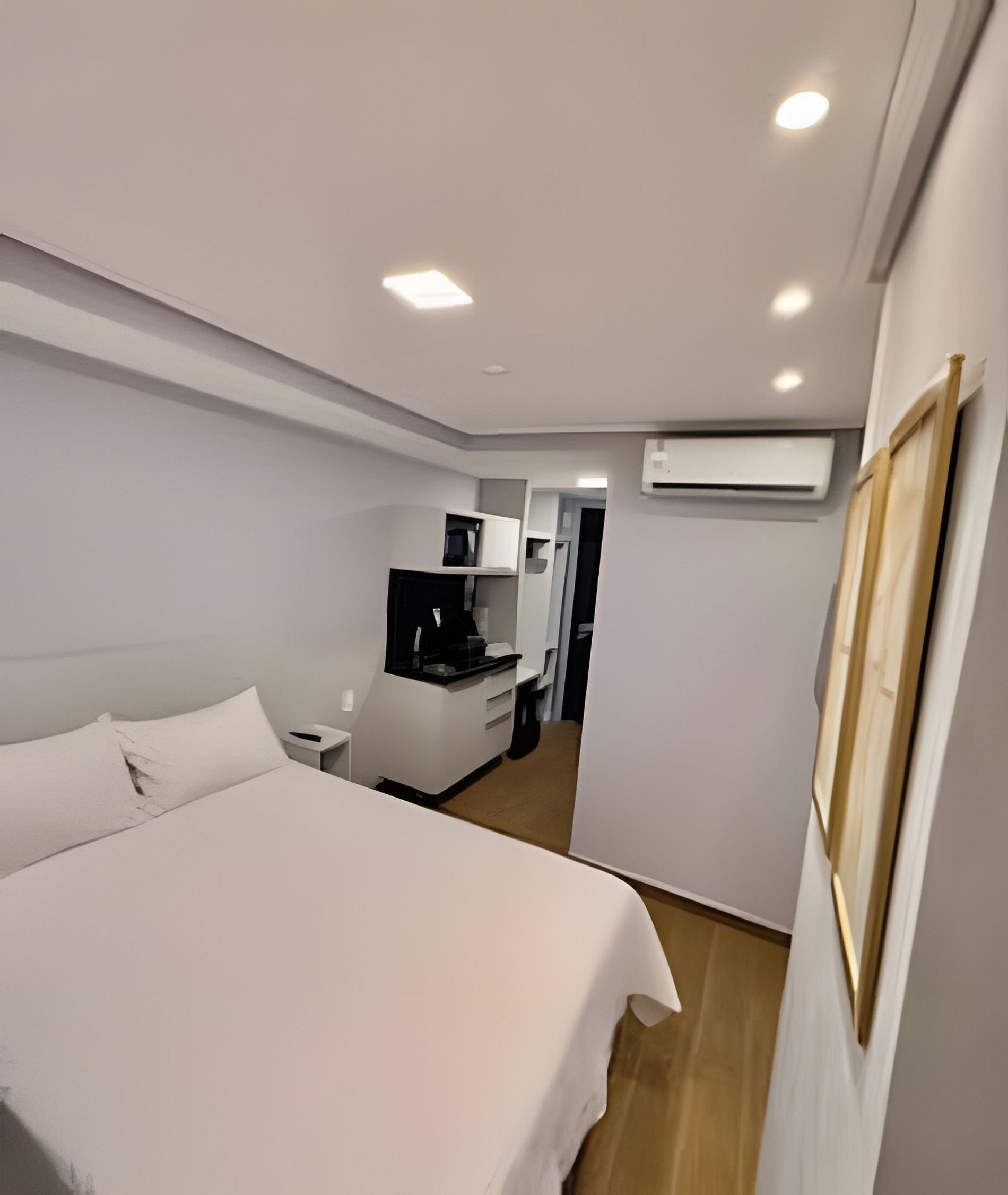Só acho que poderiam colocar um e espelho, só tem o do banheiro, só isso que deixou a desejar, porque espaço pra um espelho tem, na mesma parede que tem o ar-condicionado. Mas quem não se importa com isso, é perfeito ☺️