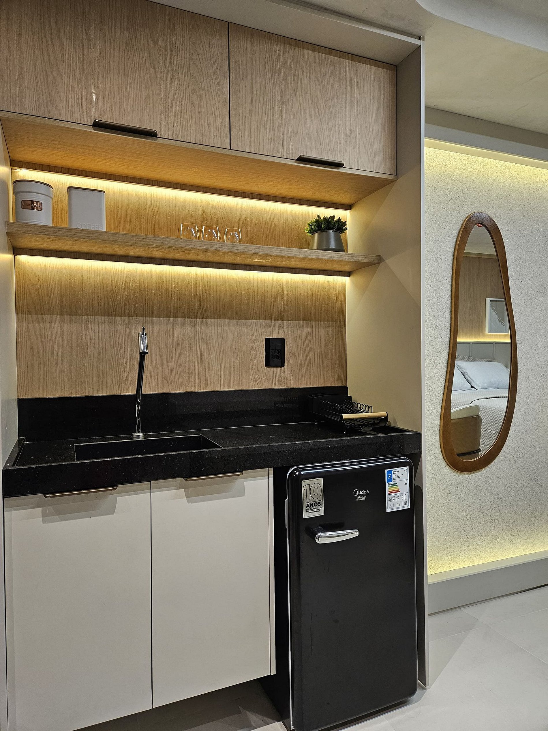 – Cozinha equipada com micro-ondas, frigobar e utensílios básicos, ideal para refeições rápidas e práticas.