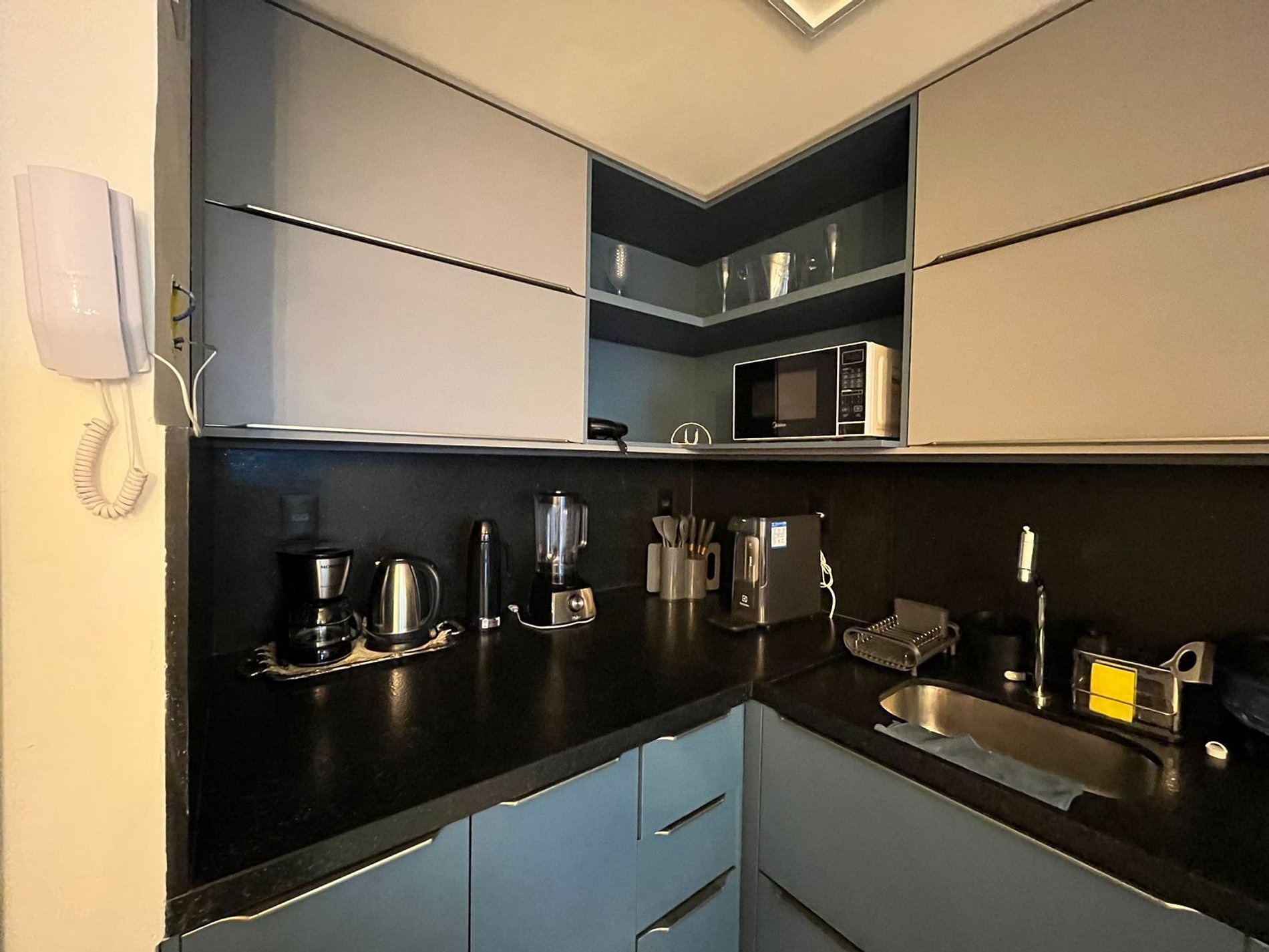 Cozinha equipada – Micro-ondas, geladeira e utensílios básicos para refeições.