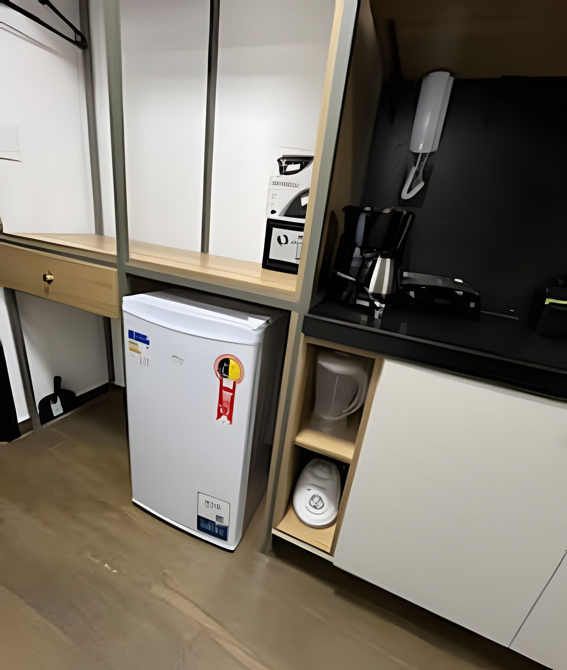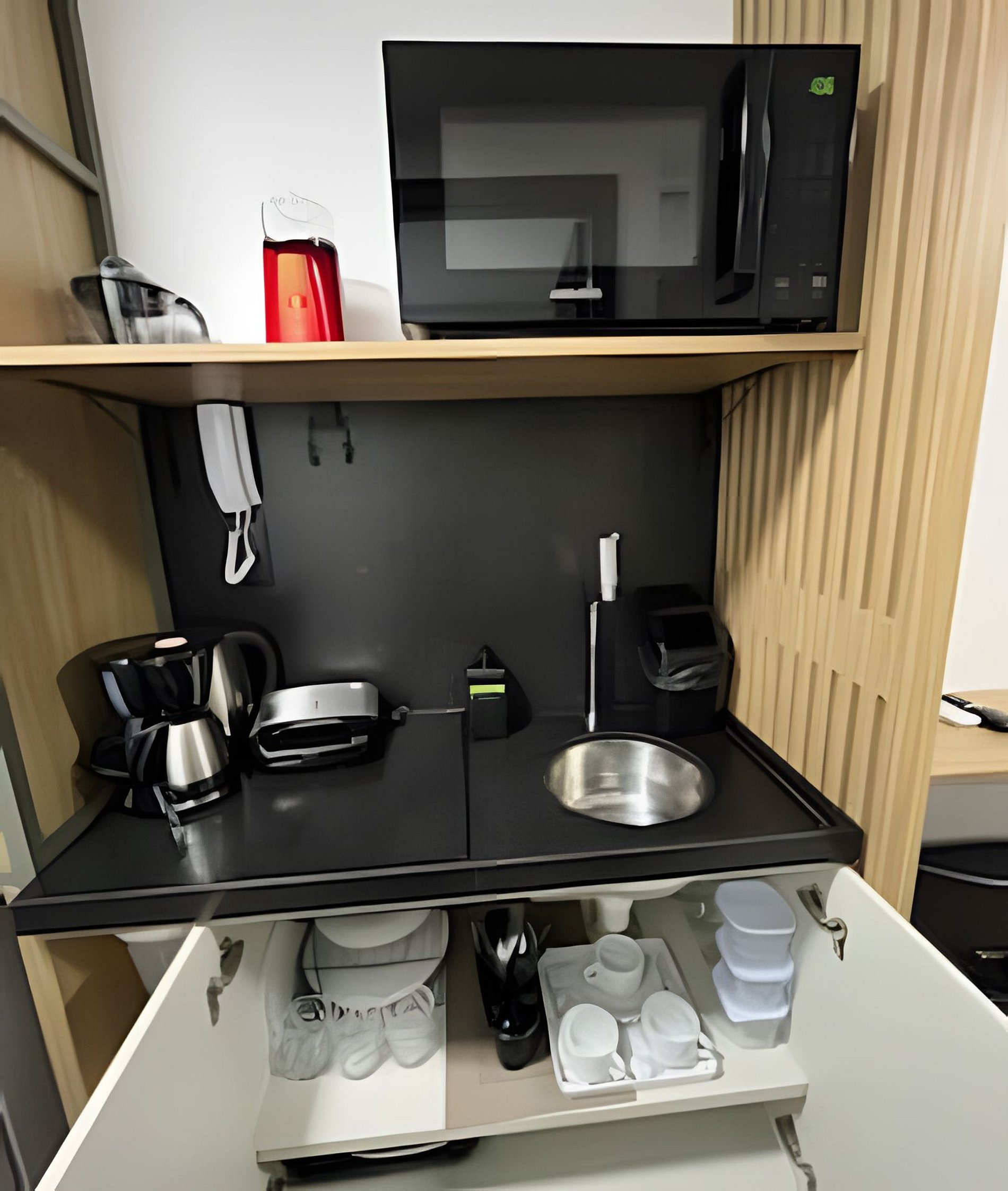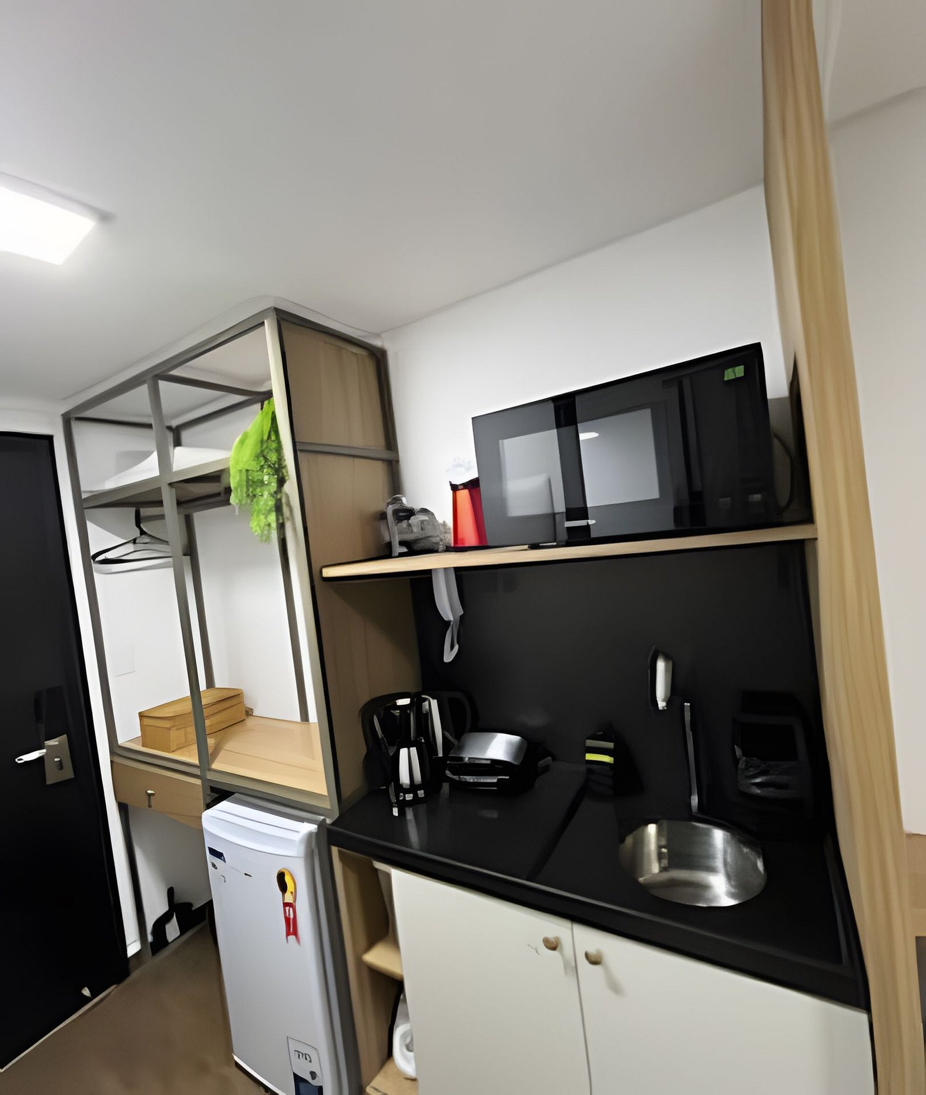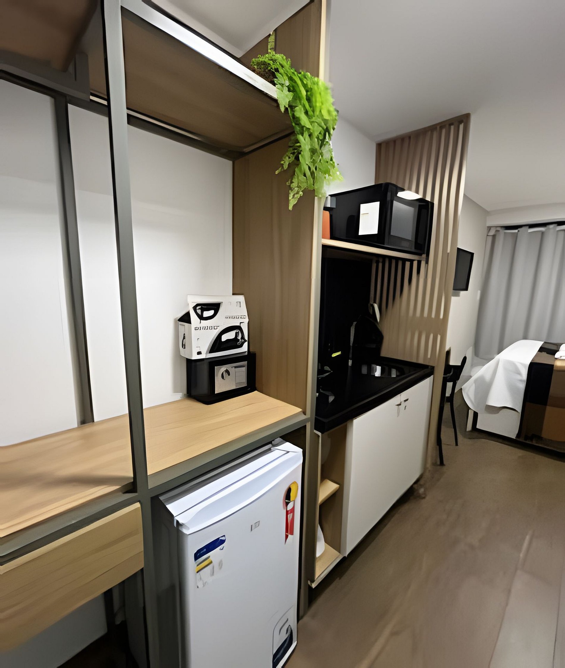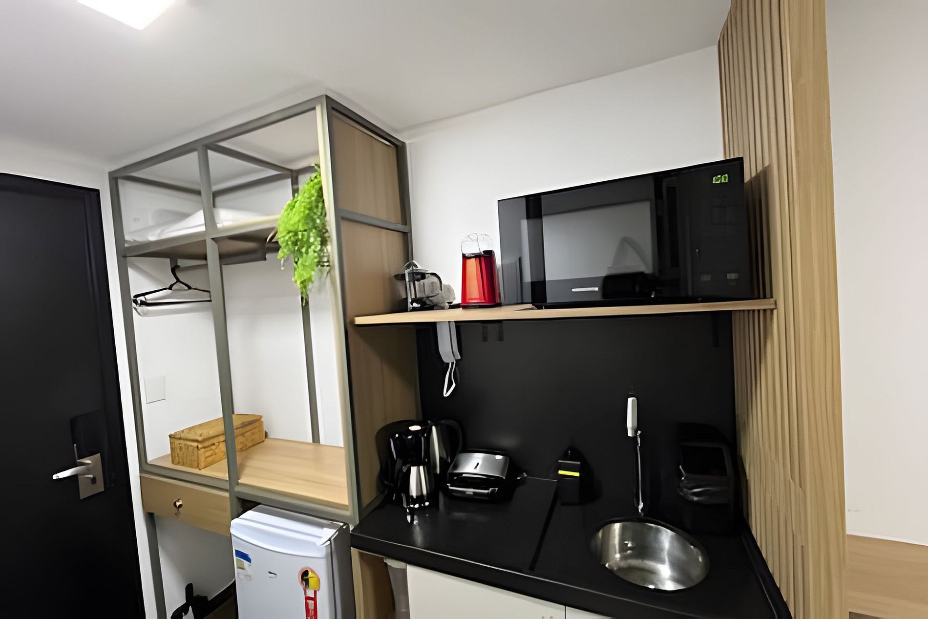 Cozinha equipada – Micro-ondas, Geladeira e utensílios completo para refeições rápidas.