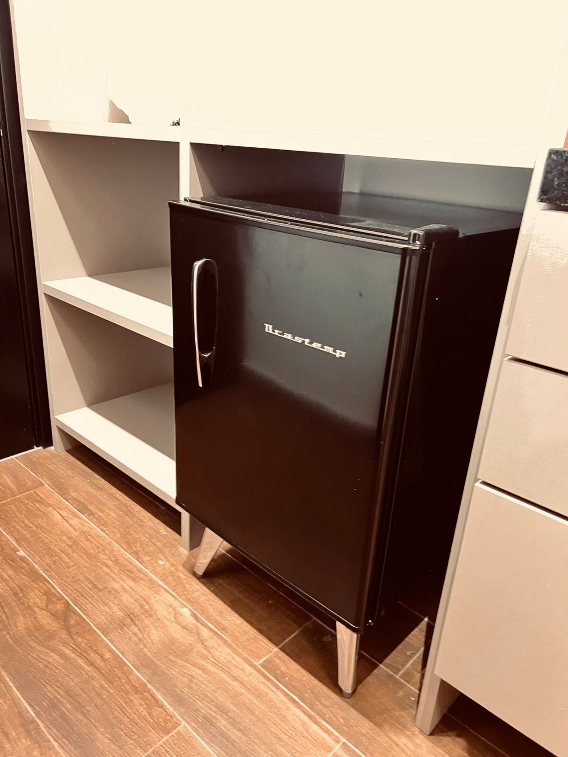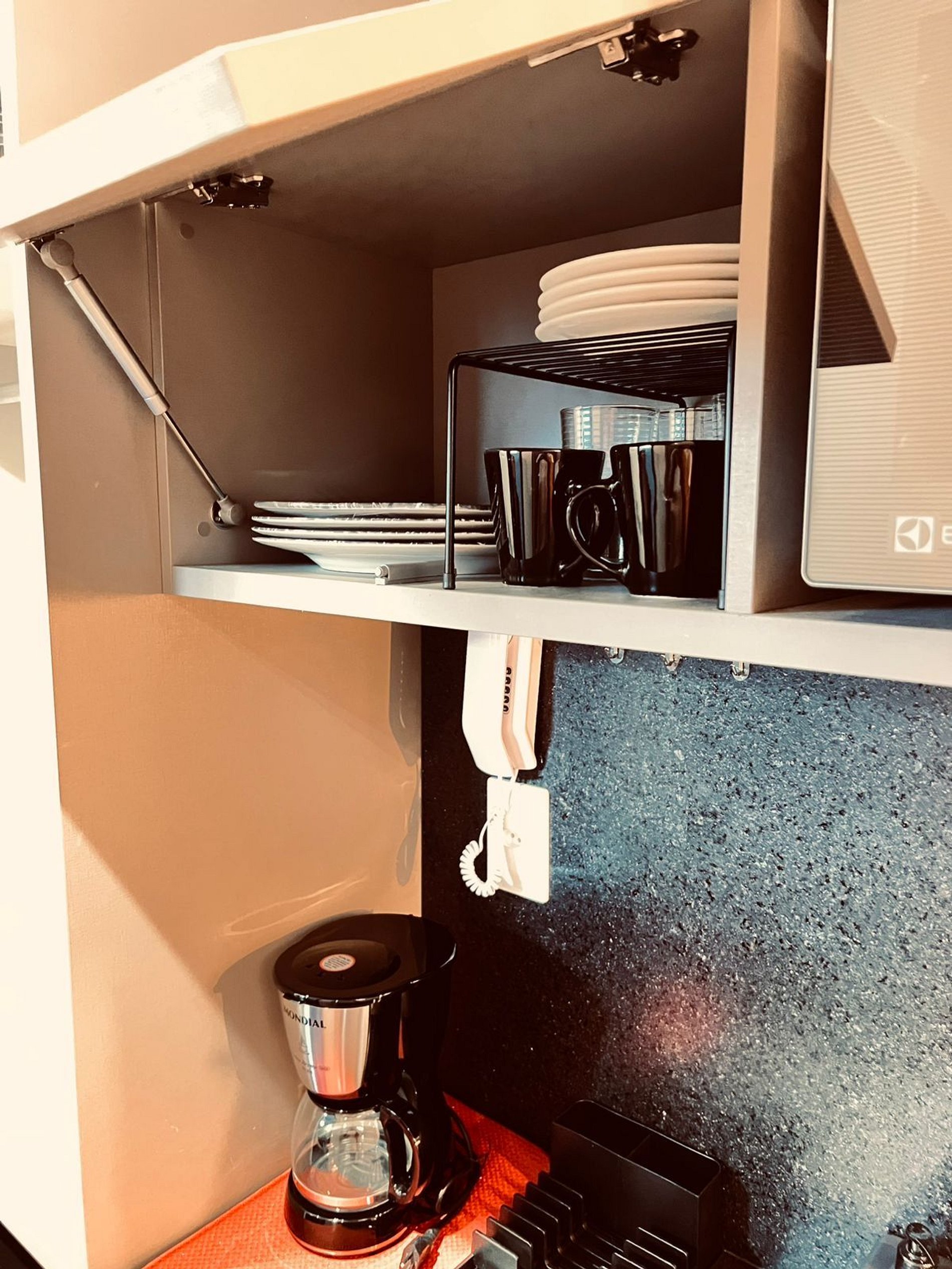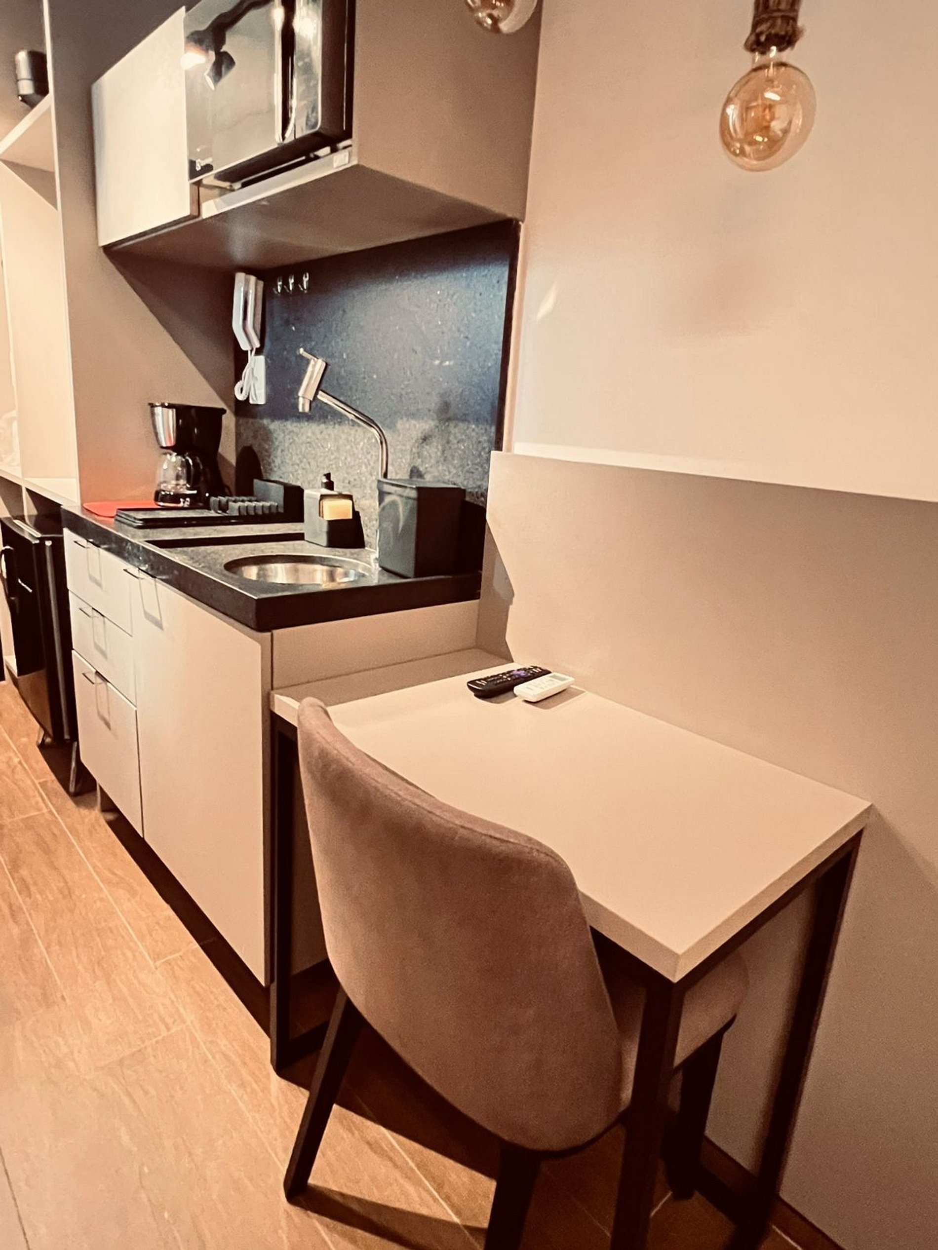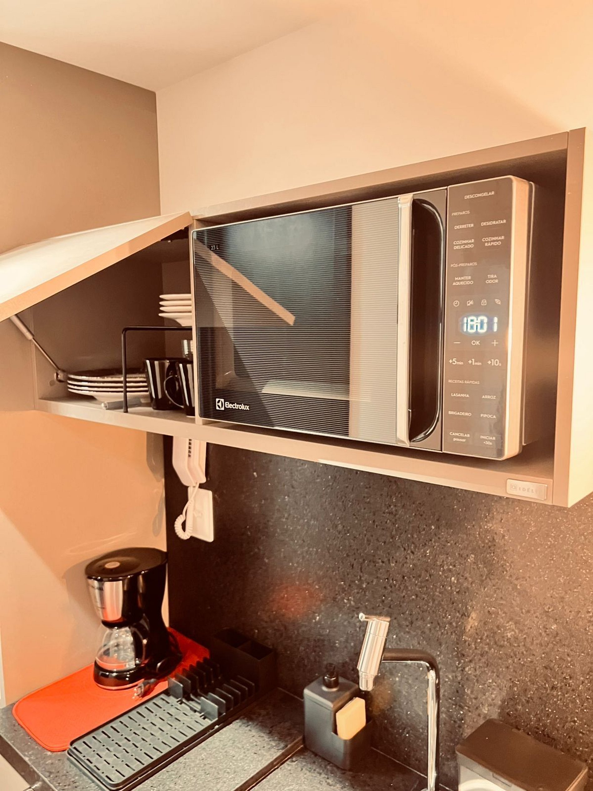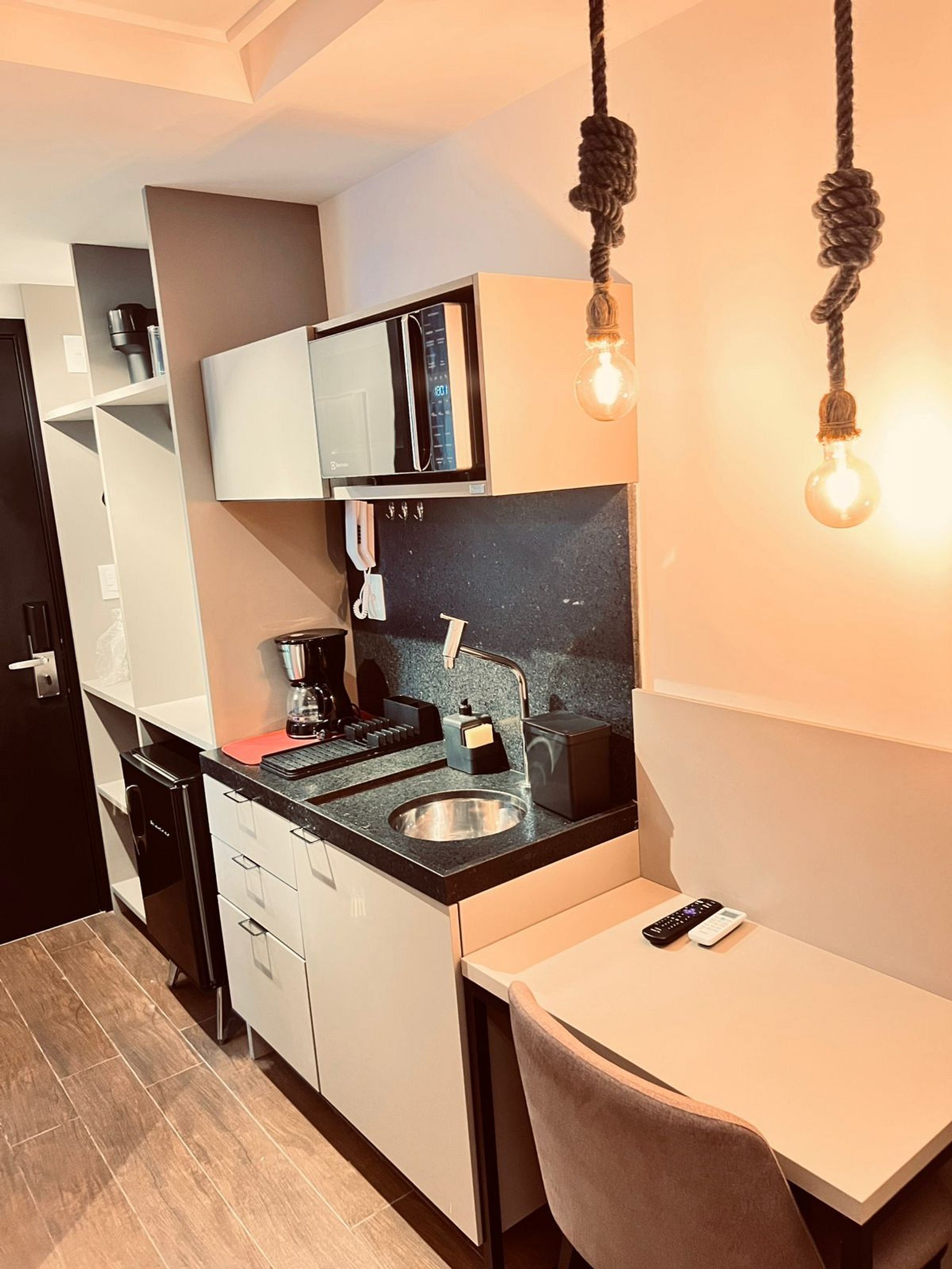 Cozinha equipada –Micro-ondas, frigobar e utensílios básicos para refeições rápidas.