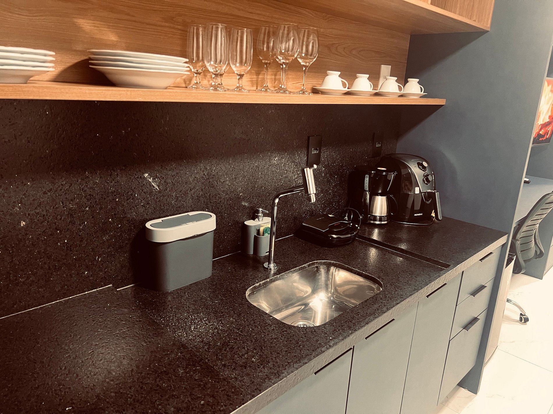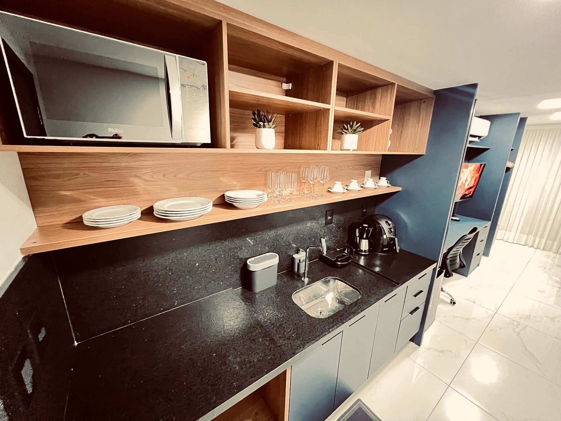 Cozinha equipada – Micro-ondas, Geladeira e utensílios completo para refeições rápidas.